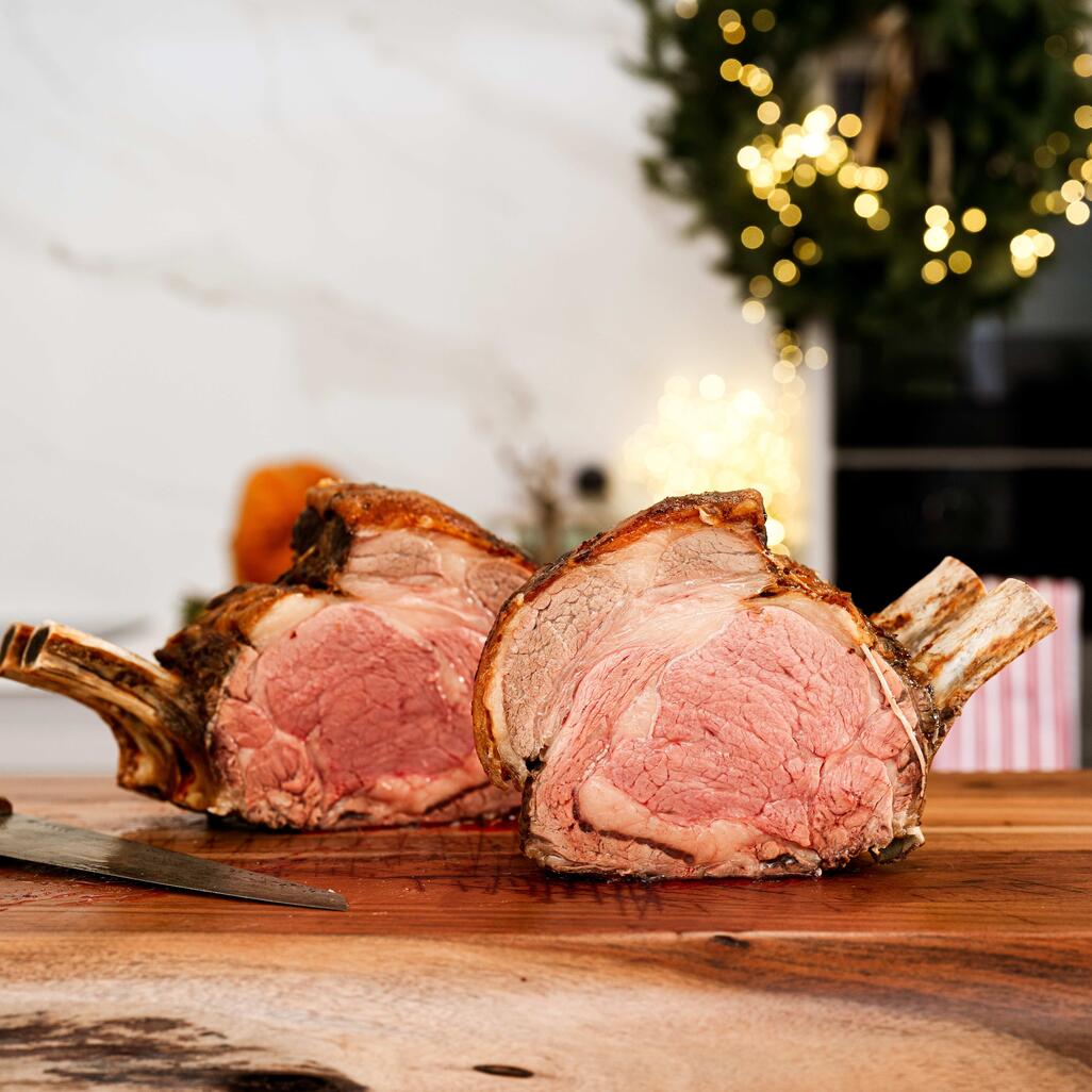 Celebrate the festive season with our exclusive Five Bone Carvery Rib of Beef, a truly magnificent centrepiece designed to impress. This extraordinary cut, crafted from grass-fed British beef, is expertly French-trimmed and hand-tied by our master butchers, showcasing five stunning ribs for a show-stopping presentation. Left on the bone for maximum flavour, the richly marbled meat caramelises beautifully as it roasts, delivering unparalleled succulence and a deep, robust taste that will elevate your Christmas feast, especially when paired with our Christmas trimmings and sauces.