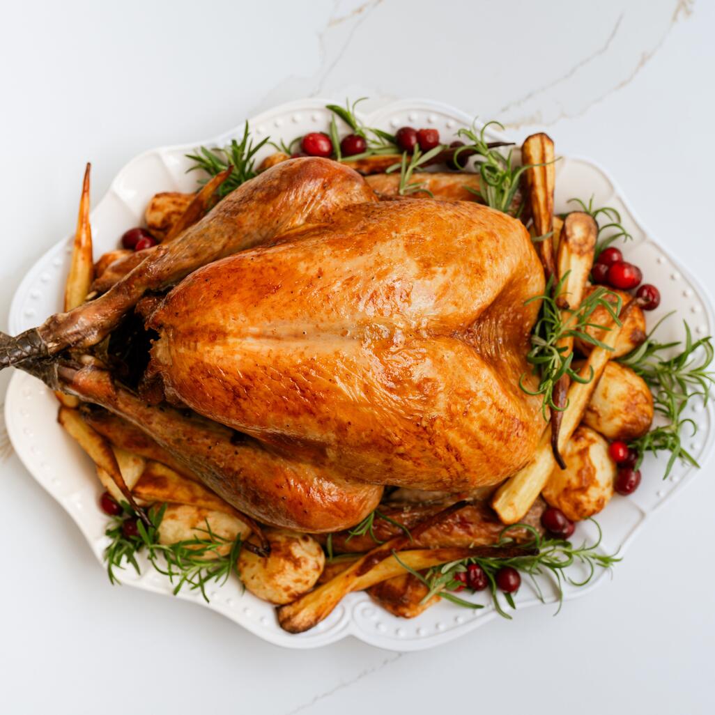 Our free-range turkeys promise the succulence and rich character required for a classic and memorable centrepiece. Our free-ranging flocks have plumped up naturally all autumn from a hearty diet foraging on natural pastures to enhance the flavour. We use heritage breed free-range Bronze turkeys, dressed for a professional finish, with ample breast meat and plenty of dark meat too. The diet these birds enjoy makes for free-range turkey with a difference and a roast that's a joy to serve and share with loved ones. The essential giblets are included allowing you to make a proper tasting gravy while being sure to serve with all the trimmings for a traditional festive spread.