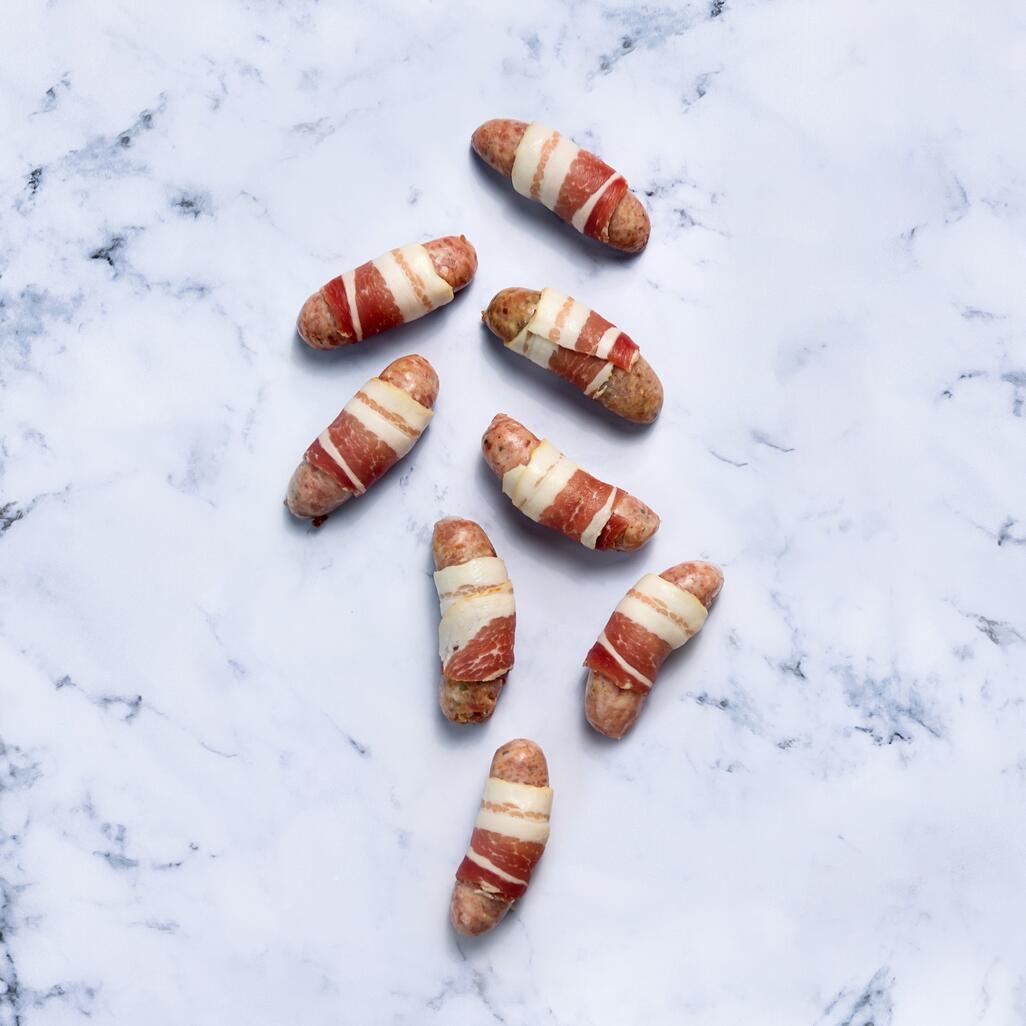 A deliciously indulgent take on our traditional Christmas pigs in blankets. The free-range pork is infused with crushed chestnut and a hint of apricot then wrapped in dry-cured streaky bacon to marry sweet and salty for a deeply satisfying combination. These bite-sized sensations make for a showstopping party canape and a must-have at Christmas dinner.