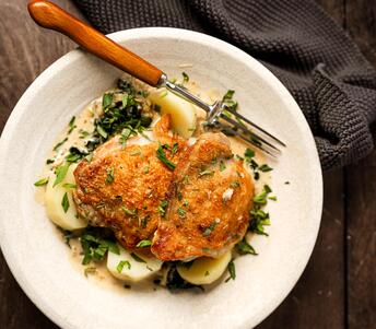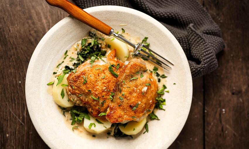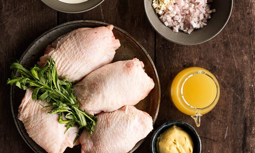 The classic old school French dish, which I first cooked at the Greenhouse restaurant in Mayfair in the 80s, Poulet à l’Estragon & is a timeless French classic. Made using free-range chicken thighs, or you can use skin-on breast, for a simple dish that exudes luxury. The tarragon gives an aniseed aroma which works wonderfully with the acids of the wine & the heat of the mustard.Method