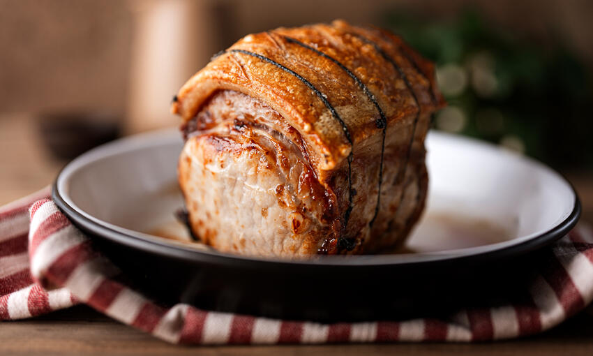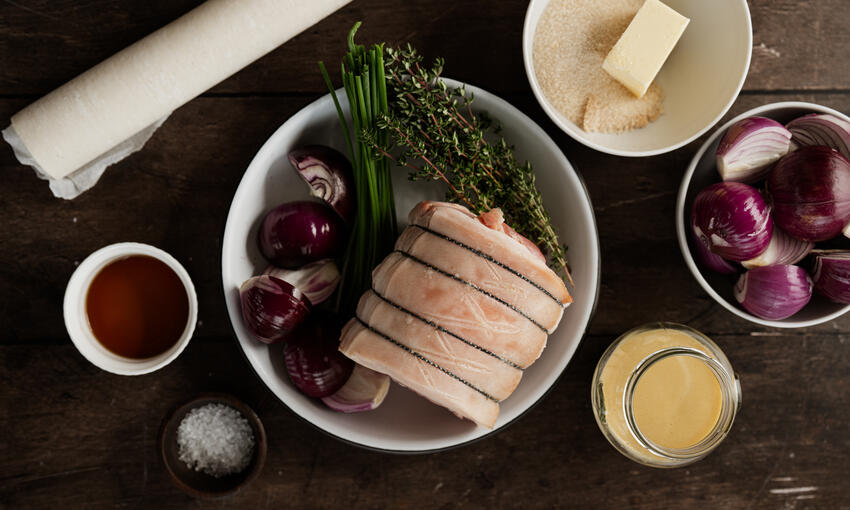 Here we take classic flavours & serve them in a modern, fun way way, sweet & sticky onions, fork tender, sitting on a crisp butter puff pastry base topped with roast pork with crackling, all finished with a sharp sherry & mustard vinaigrette. This dish works well with other pork cuts, such as belly or a simple chop. Any excess vinaigrette can be kept for use another time.Method